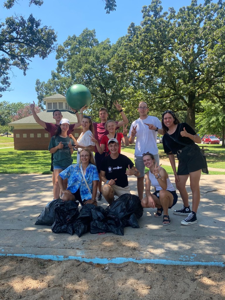 Taip pat šiandien šventėme tarptautinę studento dieną, kurios metu savanoriavome ir rinkome šiukšles Amerikietiškame parke ir aplink jį. Pasidalinome į komandas ir bėgome pildyti savo maišų. Parkas, upė net ir stadijonas liko švaresni nei bet kada!